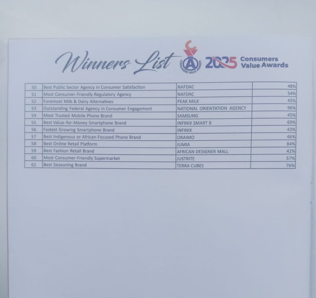 The ceremony, themed “Beyond Price: Consumer Trust, Digital Experience, and Brand Accountability,” was held on Wednesday, November 26, 2025, at the Ijakadi Hall, Radisson Blu, Ikeja GRA, Lagos, and was anchored by veteran broadcaster Adedoyin Kukoyi.